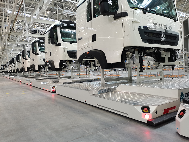 臨工智科為某重型汽車廠打造的全新智能工廠,其總裝車間全部采用AGV作為裝配和物流轉運的載體,實現了工位作業空間的最大化,是一座集柔性化”、“智能化”、“共享化”、“信息化”于一體的現代化車間。