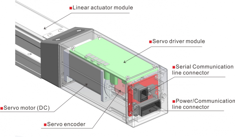 傳統(tǒng)模組的構(gòu)成:①模組底座+②直線導(dǎo)軌+③滾珠絲杠+④伺服電機(jī)+⑤伺服驅(qū)動(dòng)器 + PLC(外部控制器)