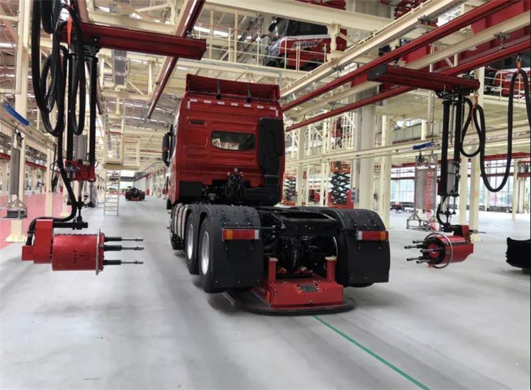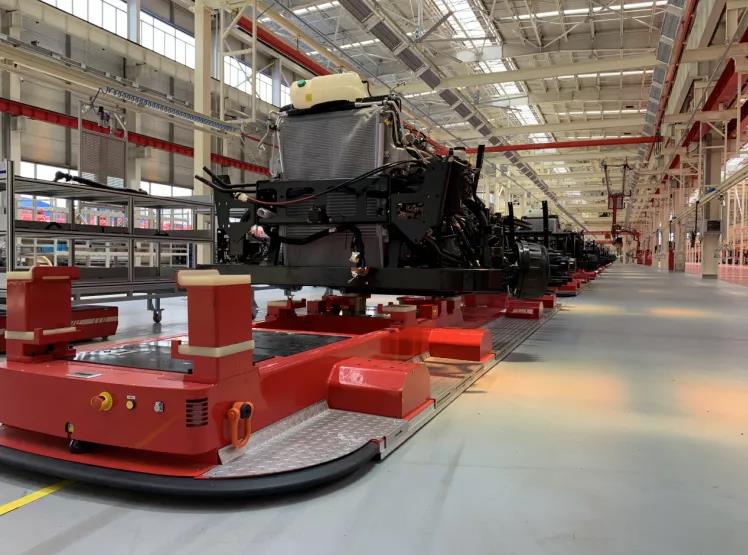 客戶為國(guó)內(nèi)某著名工程機(jī)械廠商,本項(xiàng)目由CSG華曉為其量身定制的91臺(tái)AGV, 主線配備43臺(tái)大型定制裝配AGV,單臺(tái)承重超過(guò)10T,可實(shí)現(xiàn)1m/min~30m/min無(wú)級(jí)變速。相比傳統(tǒng)的拖鏈裝配線來(lái)說(shuō),AGV裝配線具有路線可調(diào)整,工位可擴(kuò)展,投資更靈活的優(yōu)勢(shì)。除了主線的提升以外,物流自動(dòng)化同步改善,37臺(tái)SPS的潛伏牽引AGV自動(dòng)匹配主線運(yùn)行狀態(tài),按單臺(tái)份定量配貨,解放線邊庫(kù)存空間的同時(shí)又提升了裝配的準(zhǔn)確率。另外,5臺(tái)平衡懸架、前中后橋分裝頂升背負(fù)AGV,7臺(tái)發(fā)動(dòng)機(jī)分裝后牽引AGV,24臺(tái)駕駛室分裝潛伏式牽引AGV,統(tǒng)籌協(xié)作實(shí)現(xiàn)全廠區(qū)內(nèi)物流轉(zhuǎn)運(yùn)的無(wú)人化。