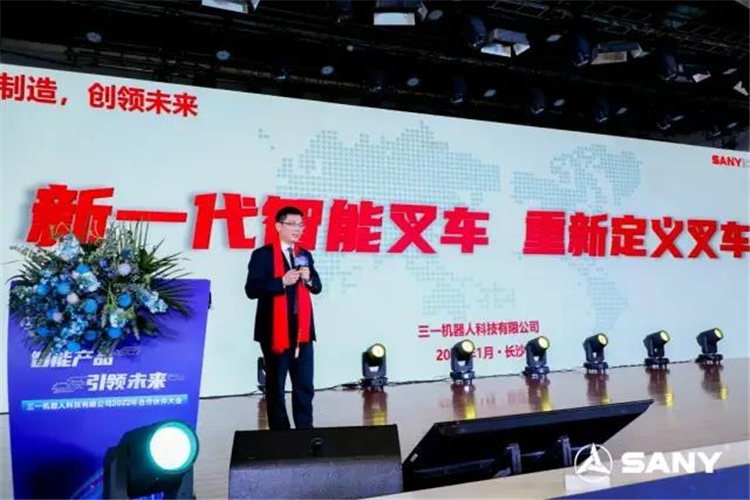 2022年1月7日,以“智能產品,引領未來”為主題的三一機器人科技有限公司2022年合作伙伴大會在湖南長沙舉行,會議上,三一機器人賦能離散智能制造一體化解決方案正式發布,AGV新品和3噸高壓鋰電平衡重叉車新品震撼亮相。