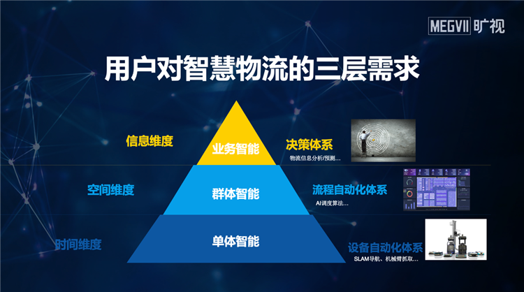 技術、市場、社會、國家政策等多要素的共同作用下,數智化升級成為企業實現降本增效的必然選擇。在曠視看來,當前用戶對智慧物流有三層需求: