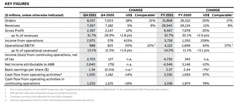 近期,ABB發布了2021年第四季度及全年業績,具體情況如下: