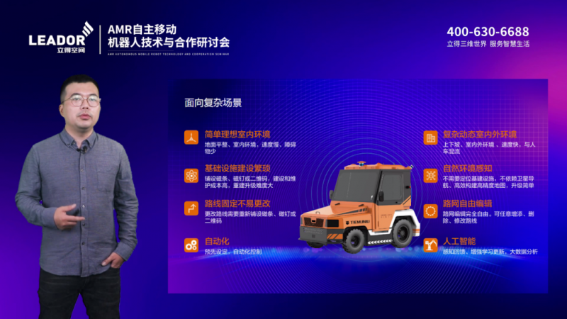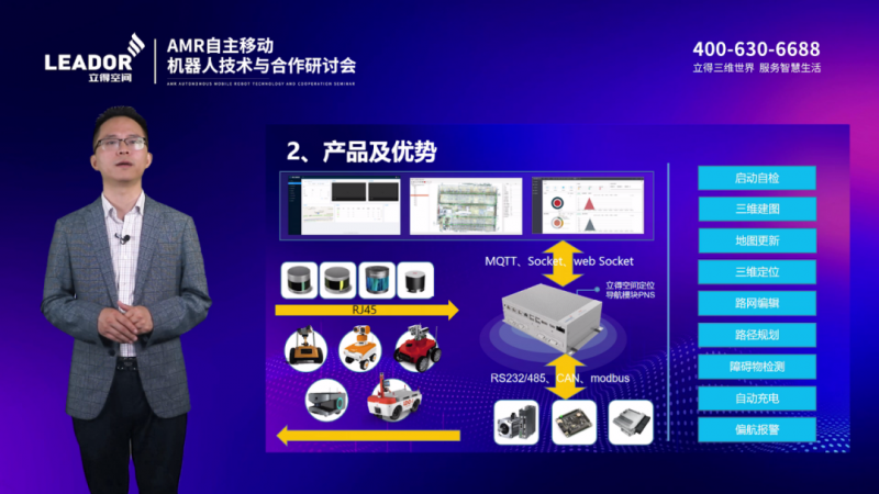 立得空間智能機器事業部銷售總經理黃維分享了立得空間在AMR自主移動機器人領域的合作案例。他指出,立得空間利用核心技術和產品已為數千家底盤廠家賦能。其中,核心產品“路霸”機器人行進系統(PNS)采用3Dslam技術路線,經過五年的迭代更新,適應各種復雜場景,在室內外、上下坡、高速和人車混流等場景實現定位導航,滿足不同場景下的柔性導航需求。