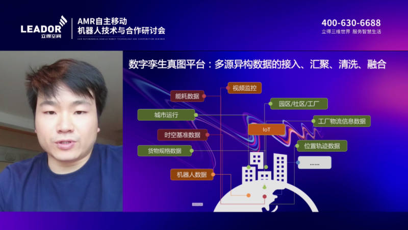 立得空間智慧城市事業部技術總監黃杰詳細介紹了“三維高精地圖+機器人”技術架構。他提到,立得空間研發的“真圖“數字孿生時空數據服務平臺”基于實景三維、高精地圖、物聯網、仿真、AI、空間網格碼等關鍵技術,可接入海量多維數據、進行匯聚、清洗、融合、管理及可視化,快速構建數字孿生時空大數據底座。