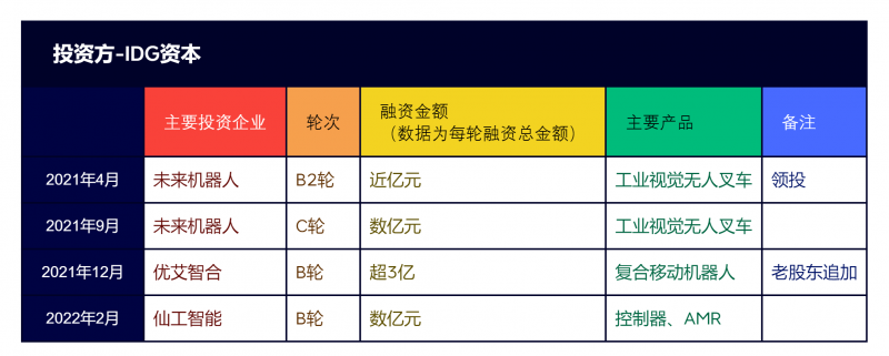 2021年4月至2022年2月期間,IDG資本在移動(dòng)機(jī)器人領(lǐng)域投資了未來(lái)機(jī)器人、優(yōu)艾智合和仙工智能三家移動(dòng)機(jī)器人企業(yè)。