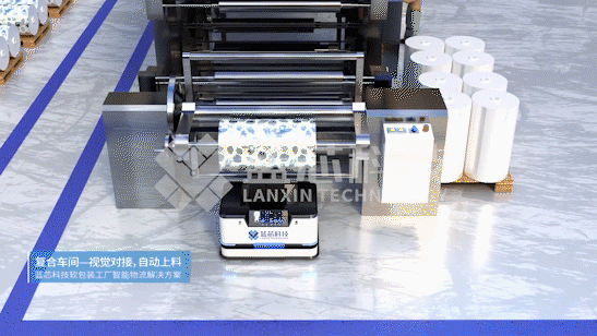 針對以上痛點,藍芯科技以智能拆包裝置、打橫裝置、上下料機器人、無人叉車、搬運機器人、分切下料打包自動線為主體,結合智能倉儲設備、信息化管理系統,實現包裝企業來料自動拆包、物料自主搬運、卷料自動上/下料、庫位自動識別、成品/半成品/原料自動出入庫作業。