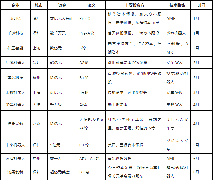 從資金投入來看,大部分企業融資金額都在億元級以上,其中,海柔創新與未來機器人兩家企業在上半年拿到了行業最多的融資。