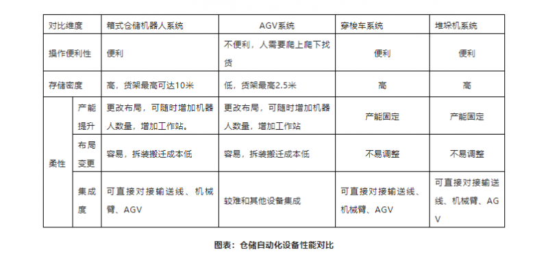 在3PL及電商倉儲中,當前主要有4類自動化解決方案,箱式倉儲機器人/AGV系統(tǒng)/穿梭車系統(tǒng)/堆垛機系統(tǒng),四類方案各有其優(yōu)劣勢。